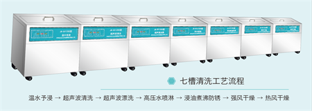 超聲波清洗→超聲波漂洗→高壓水噴淋→浸油煮沸防銹→熱風(fēng)干燥